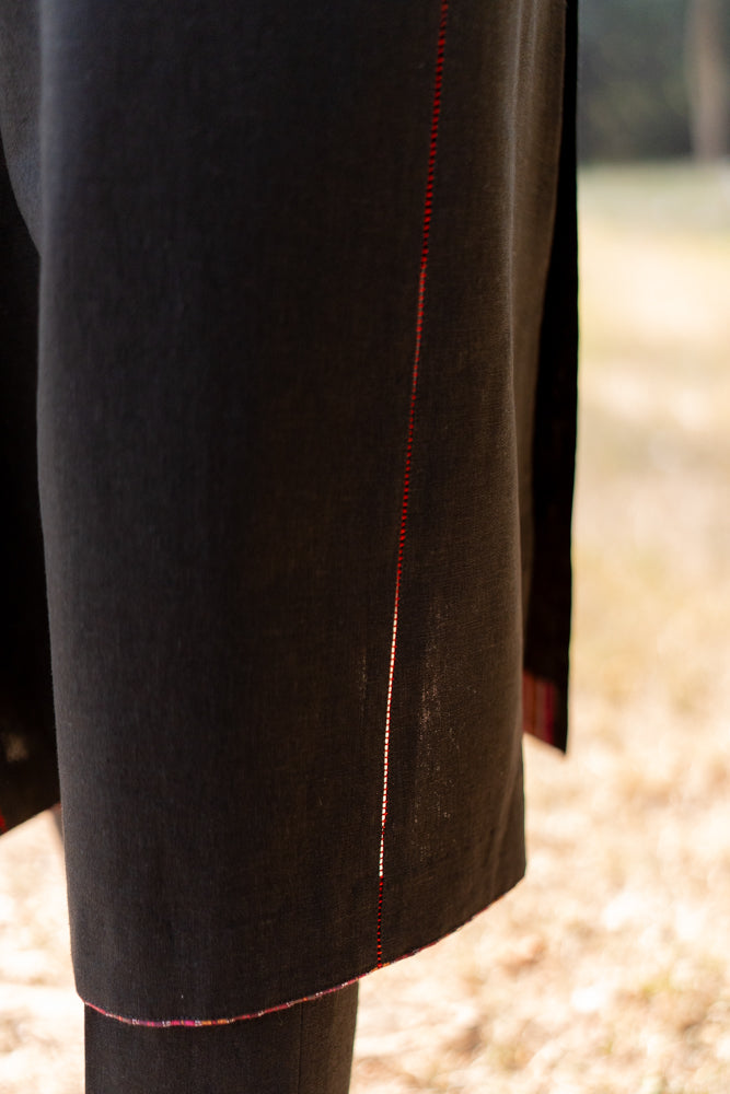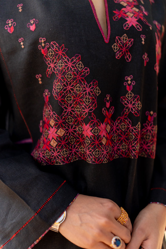 The black phulkari shirt from this collection stands out as a truly unique piece. It brings together a mix of traditional motifs across the front and sleeves, each one stitched by hand in the classic phulkari style. The contrast of rich threadwork on deep black fabric gives it a strong, elegant presence, making it a perfect blend of heritage and contemporary wear.