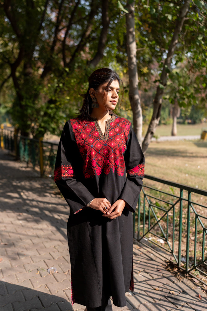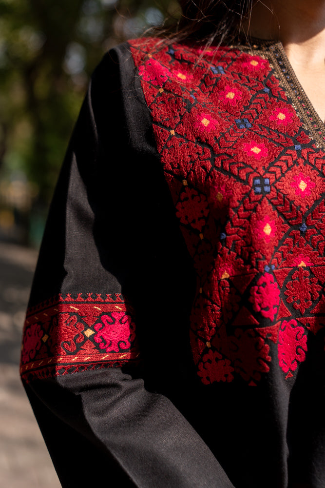 The black phulkari shirt from this collection stands out as a truly unique piece. It brings together a mix of traditional motifs across the front and sleeves, each one stitched by hand in the classic phulkari style. The contrast of rich threadwork on deep black fabric gives it a strong, elegant presence, making it a perfect blend of heritage and contemporary wear.