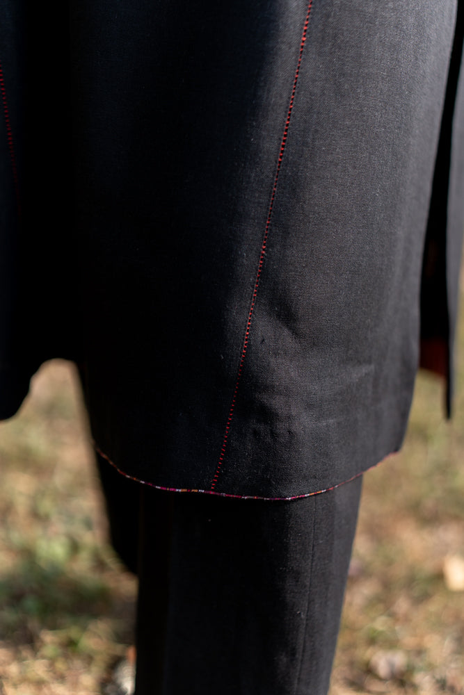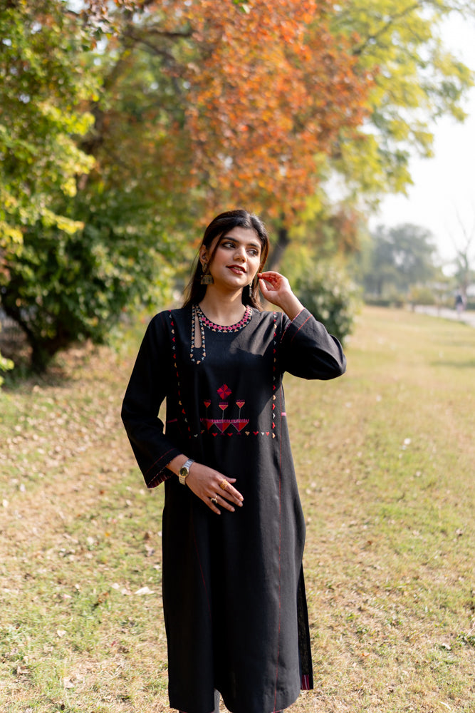 This phulkari kurta features a clean loop neckline and hand embroidery across the front and sleeves, bringing a soft, traditional charm to the silhouette. The motifs are crafted in the classic phulkari style, adding texture and depth without overwhelming the design. It’s an easy, graceful piece that blends everyday comfort with the richness of heritage.